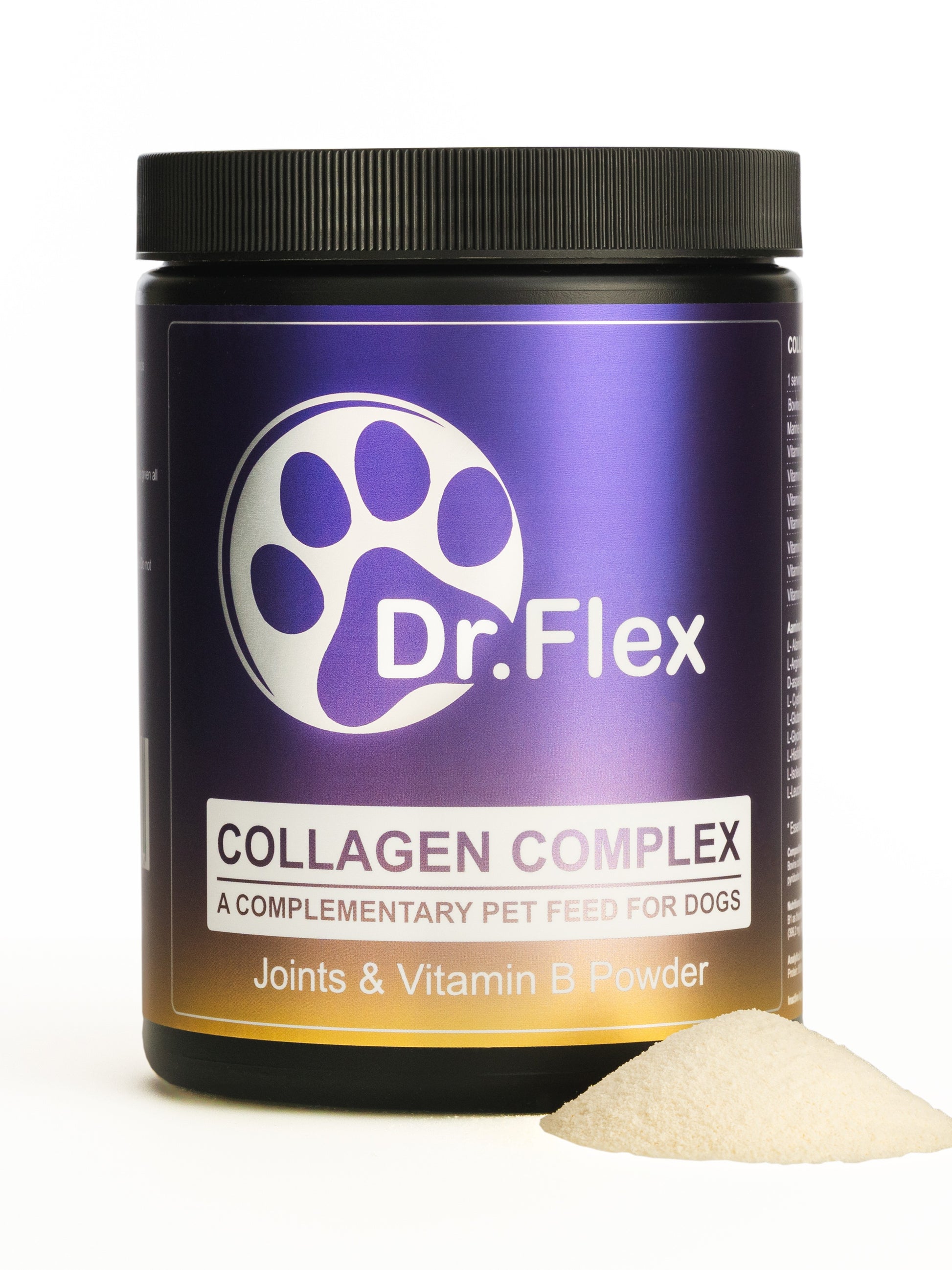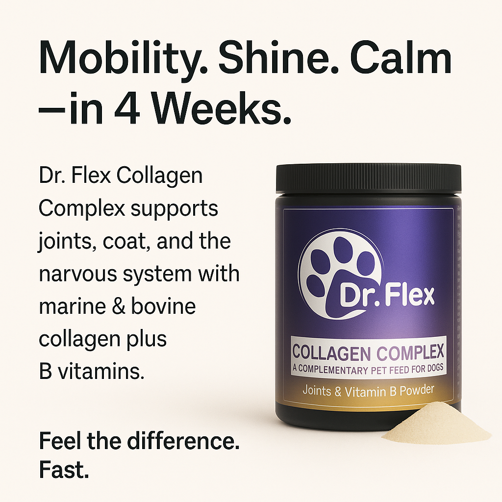 High-quality collagen complex for dogs with types I, II, and III collagen from bone, bovine, and marine sources. Supports joints, bones, skin, coat, and mobility. Enriched with hyaluronic acid, bioactive peptides, B vitamins, and amino acids – ideal for osteoarthritis, hip problems, or daily preventative care. Suitable for dogs of all ages.
